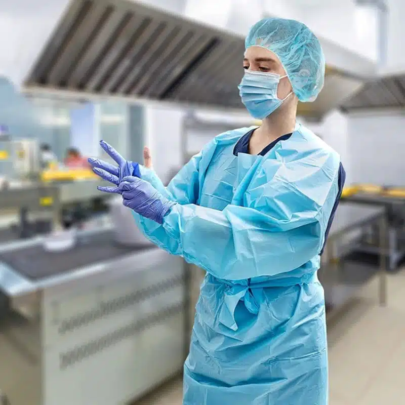 2 . تجهيز الأغذية: يمكن ارتداء رداء الوقاية الشخصية في تطبيقات معالجة الأغذية ومناولة الأغذية لحماية العمال من التعرض لملوثات الأغذية وغيرها من المواد الخطرة المحتملة.
