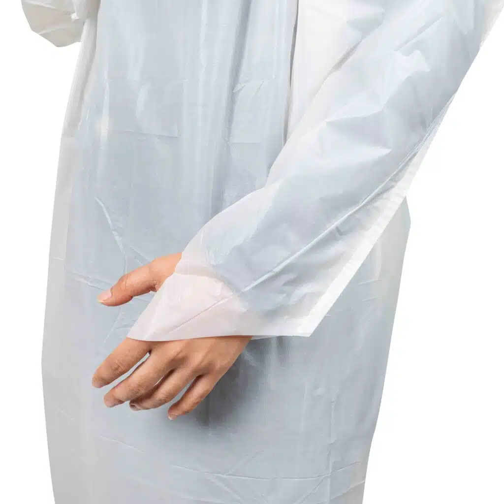2. رداء الأكمام المطاطية CPE: تحتوي هذه العباءات على أشرطة مطاطية حول المعصمين، مما يخلق ملاءمة مريحة ويساعد على إبقاء الأكمام في مكانها. توفر الأصفاد المرنة إحكامًا جيدًا حول المعصمين، مما يمنع دخول الملوثات إلى الرداء. الأساور المرنة هي سمة أكثر شيوعًا في العباءات الواقية ويمكن إقرانها بسهولة مع القفازات لزيادة الحماية.