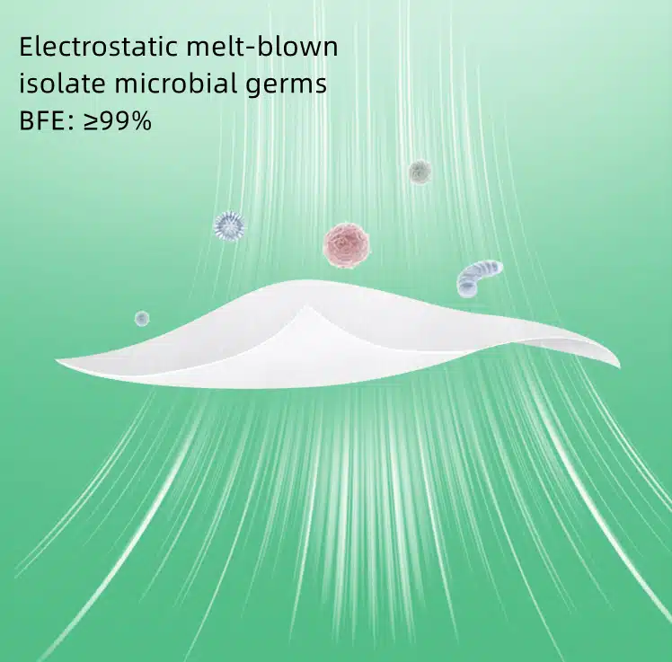 | الطبقات: | Three layers (outer layer – hydrophobic non-woven layer, middle layer – meltblown filter, inner layer – soft absorbent non-woven layer) |