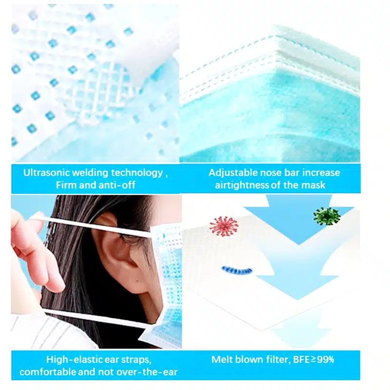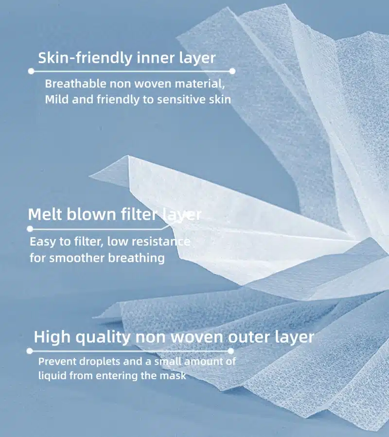 - Inner Layer: The innermost layer of the mask is made from a soft, absorbent non-woven material, such as spunbond polypropylene. This layer is designed to absorb moisture, such as saliva and nasal discharge, from the wearer. It also provides comfort, making the mask easier to wear for extended periods.