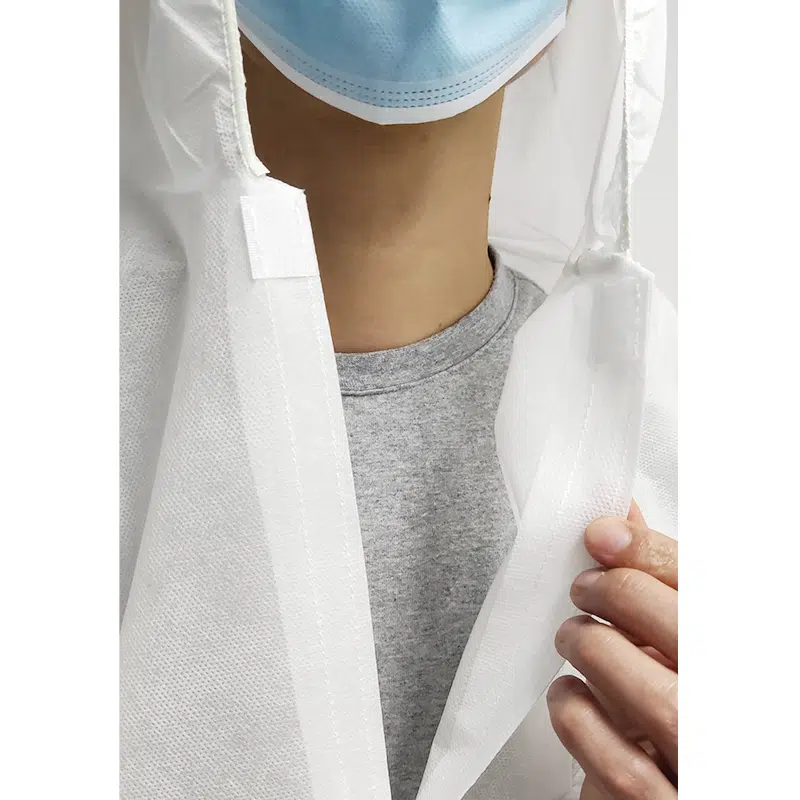 The Disposable Lab Coat with Hood features four Velcros in front, which makes it easy to wear and remove. The Velcros are placed in a way that allows the lab coat to be fastened and unfastened quickly and easily. We could add more velcros in front as your request.