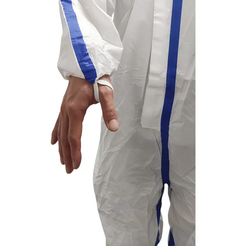 1.Thumb loops are added: help ensure that the coverall’s sleeves do not slide up the arm, the wrists and lower arms are fully covered, minimizing the risk of contamination and exposure to infectious materials.When the coverall’s sleeves are securely in place with the help of thumb loops, it becomes easier to put on gloves without the sleeves bunching up or sliding.