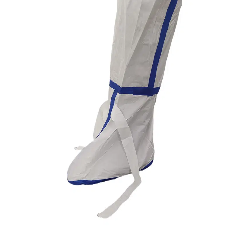 3.With boot, and ties on the ankle: boots provide an additional layer of protection for the feet. Ties on the ankles help to secure the coverall’s boots in place, ensuring a snug fit and minimizing the risk of contaminants entering from the bottom of the coverall. This also prevents the boots from slipping or moving around during work, which can be uncomfortable and distracting for the wearer.
