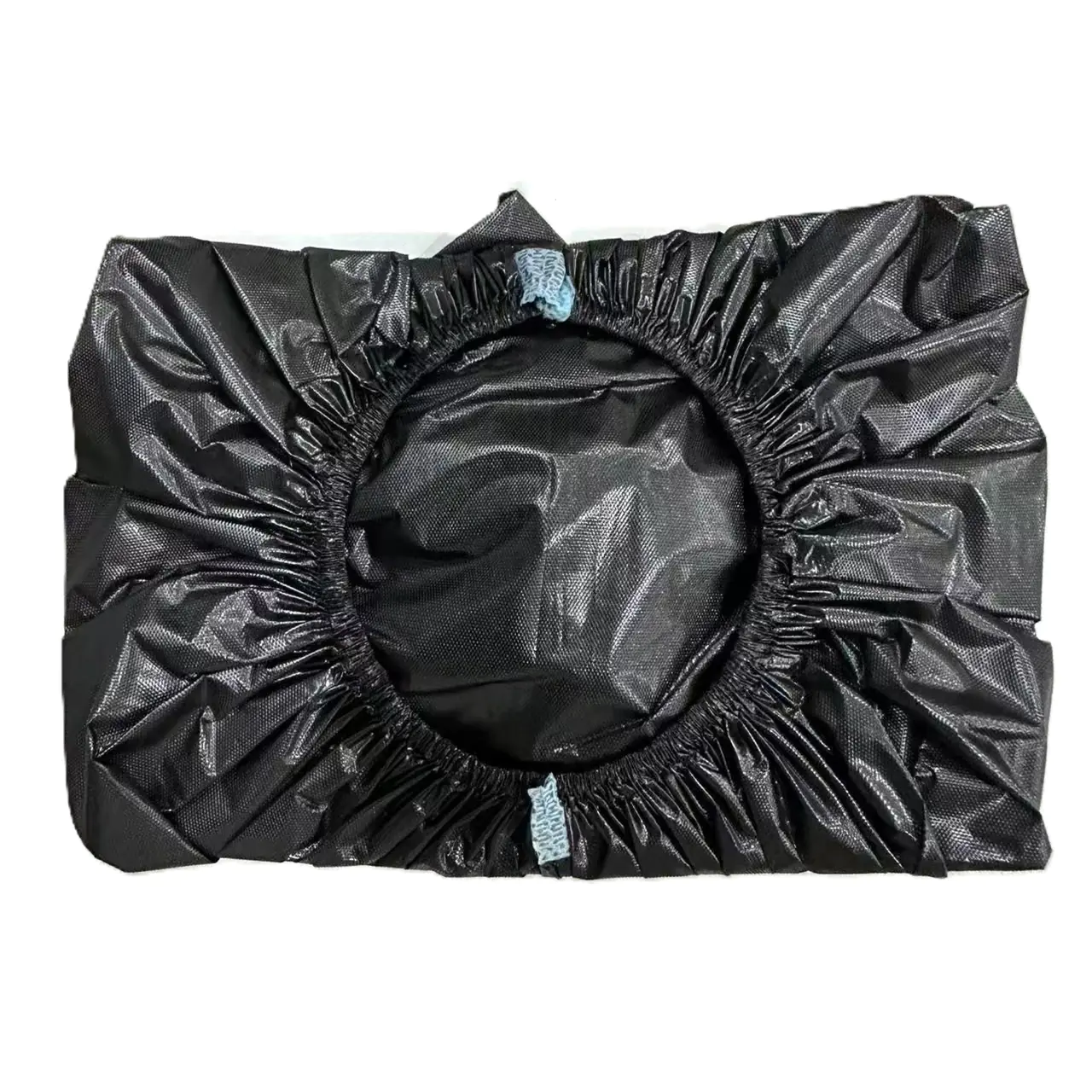 Black car tire covers with elastic edges Cardboard box with facing instructions highlighted.