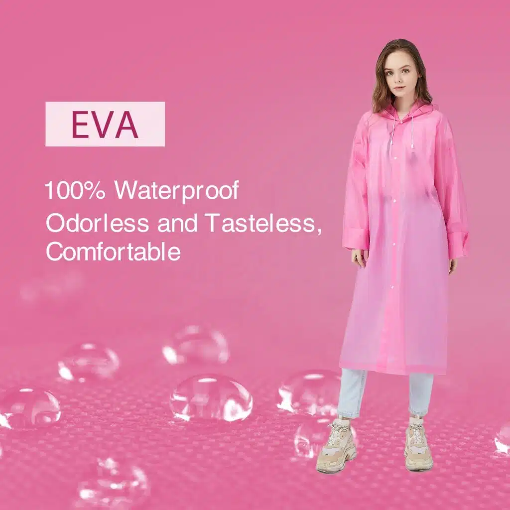 A: EVA (ethylene-vinyl acetate) is a high-quality, lightweight, and durable material that is waterproof and environmentally friendly. Some of the benefits of EVA material include its flexibility, resistance to cracking, and excellent insulation properties. These features make it an ideal choice for raincoats, providing reliable protection against rain and wet conditions.
