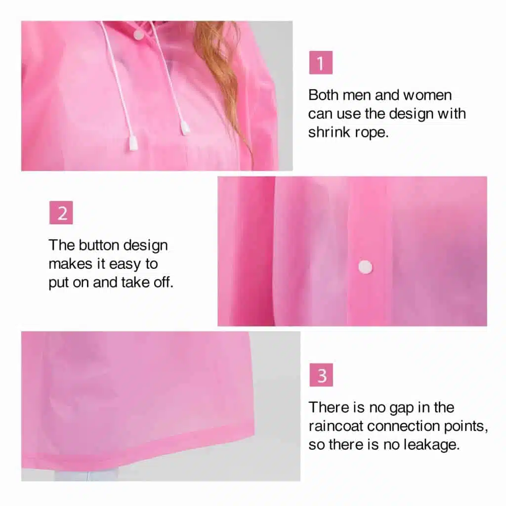 Featuring a hood with shrink rope, front with buttons for easy put on and take off, and seamless connection points, this EVA raincoat offers a secure and comfortable fit while ensuring ease of movement. Our top-quality EVA raincoat is perfect for outdoor activities, events, and daily use, providing reliable protection from rain and wet conditions without compromising on style and comfort.