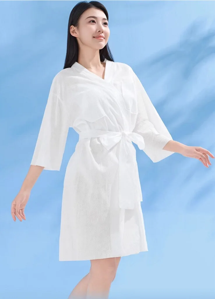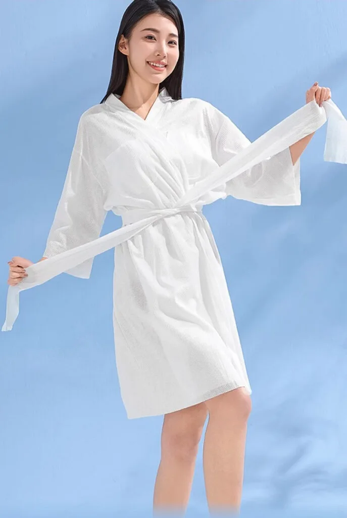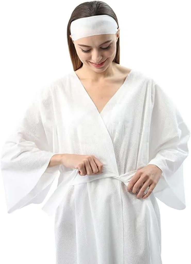 Disposable salon robes are clothes you wear one time at a salon. They’re made of soft, light stuff that feels nice on your skin. They keep your regular clothes safe from hair dye or other messes. Since you use them only once, they stay very clean and safe for everyone.